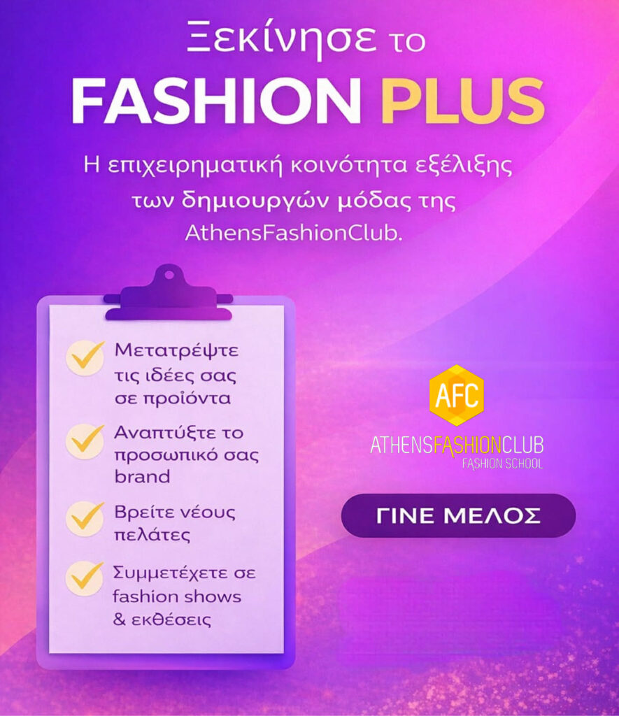 Αν θέλετε να κάνετε το επόμενο βήμα, να ξεκινήσετε ένα δικό σας επιτυχημένο Fashion Brand και να εξελιχθείτε επαγγελματικά, το Fashion PLUS είναι για εσάς. Εγγραφείτε σήμερα και γίνετε μέρος της πιο δυναμικής κοινότητας μόδας στην Ελλάδα